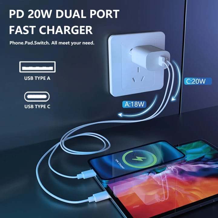 الوصف: شاحن USB-C بقدرة 20 واط، مزود بتقنية Power Delivery (PD) لتوفير شحن سريع وآمن للأجهزة المتوافقة. يتميز بتصميم عصري وعملي، وهو معتمد بشهادة CE لضمان الجودة والأمان. مثالي لشحن الهواتف الذكية، الأجهزة اللوحية، وأجهزة أخرى تدعم الشحن السريع.